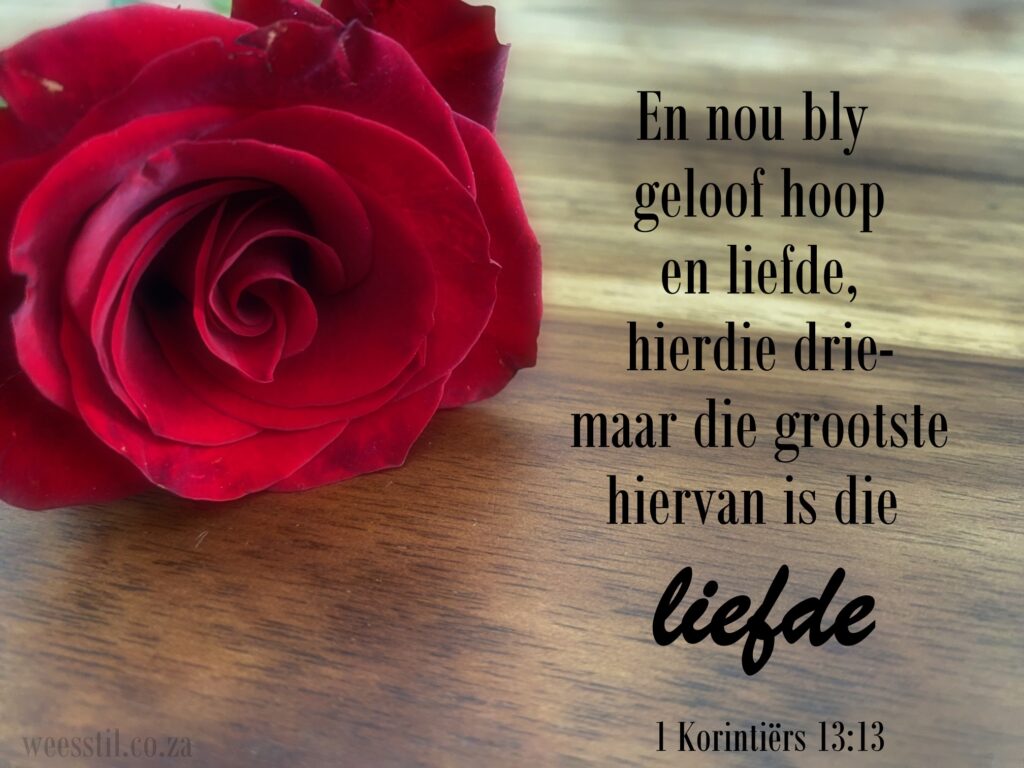 Die liefde is geduldig, wees geduldig met mekaar en vergewe mekaar. (Kol. 3:13) As jy net dié liefhet wat vir jou liefhet, watter loon kan jy dan nog verwag? (Matt. 5:46) Wees altyd beskeie, vriendelik en geduldig, en verdra mekaar in liefde. (Ef. 4:2) Continue reading “1 Korintiërs 13”