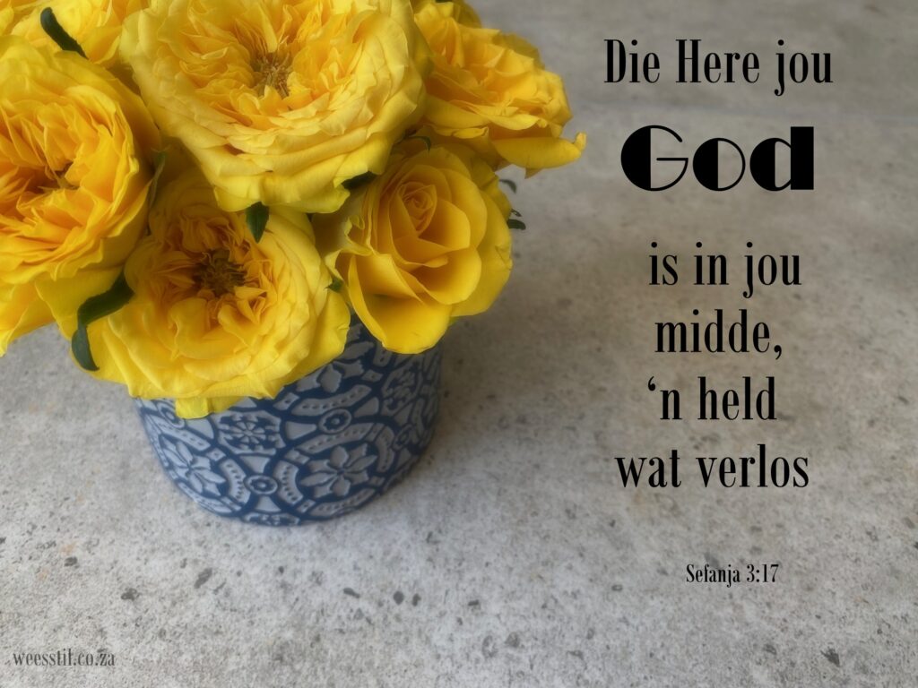 Bid lyk dalk vir my anders as vir jou. Jy kan enige tyd met Hom gesels. Sefanja 3:17 (2020) sê so mooi: Die Here jou God is in jou midde, ‘n held wat verlos. Altyd in jou midde, altyd by jou… En nou kan ons met VRYMOEDIGHEID na God gaan… (1 Joh. 5:14)