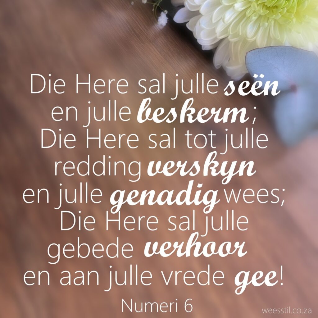 Mag hierdie versies vir jou tot seën wees as jy die ou jaar instap en met ‘n vaste geloof die nuwe jaar betree. My gebed vir jou vir die nuwe jaar wat vol belofte vir jou wink is so mooi opgeteken in Numeri 6: 24-26: