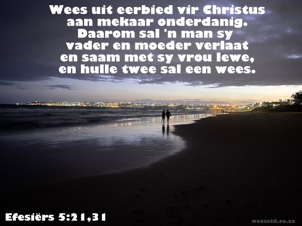 Die enigste persoon wat ons werklik kan verander is onsselwers. Is dit nie al ‘n goeie begin nie? Ek wil afsluit met ‘n besonderse stukkie in die Bybel, oorgeskryf deur Eugene H Peterson, (The Message, Ephesians 5:21-33)
