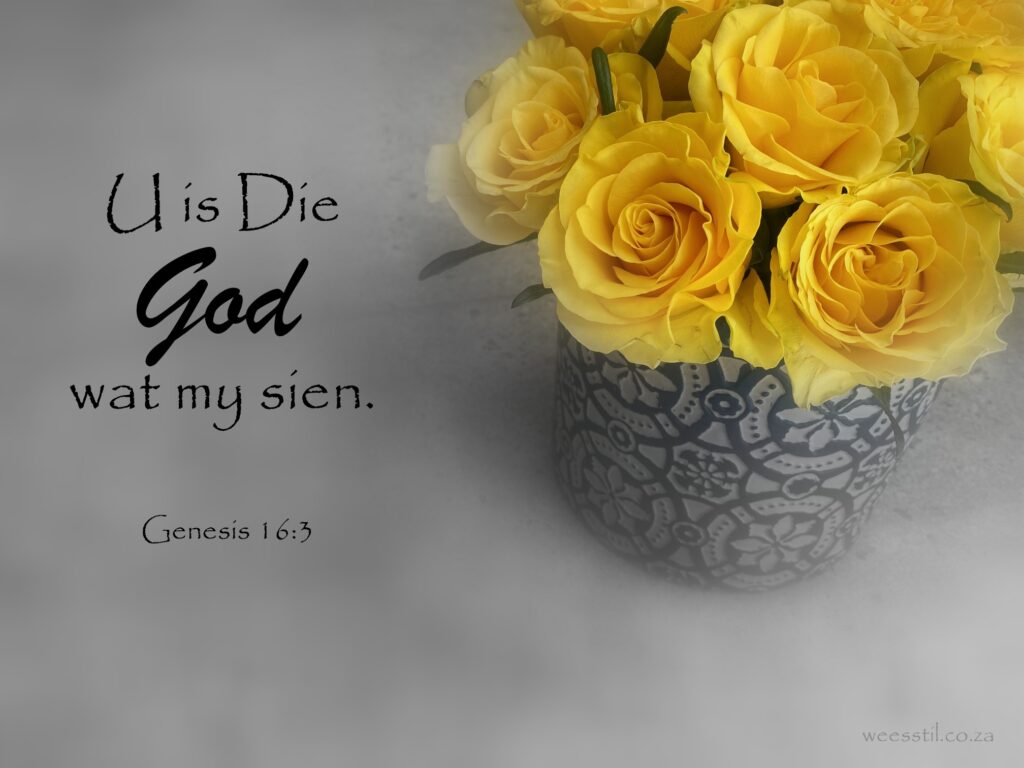 Hagar het nie gebid en gesmeek nie… Sy het net gesit en gewag… sonder plan, sonder heenkome. Moeg, moedeloos, swanger, alleen, oorgelaat aan genade en self. God daag op in die woestyn, want dit is waar Hagar Hom nodig het. Hagar het toe die Naam aangeroep van die HERE wat met haar gepraat het: “U is die God wat my sien”. Want sy het gesê: “Het ek Hom wat my sien, ook hier gesien?” (Gen. 16:13)