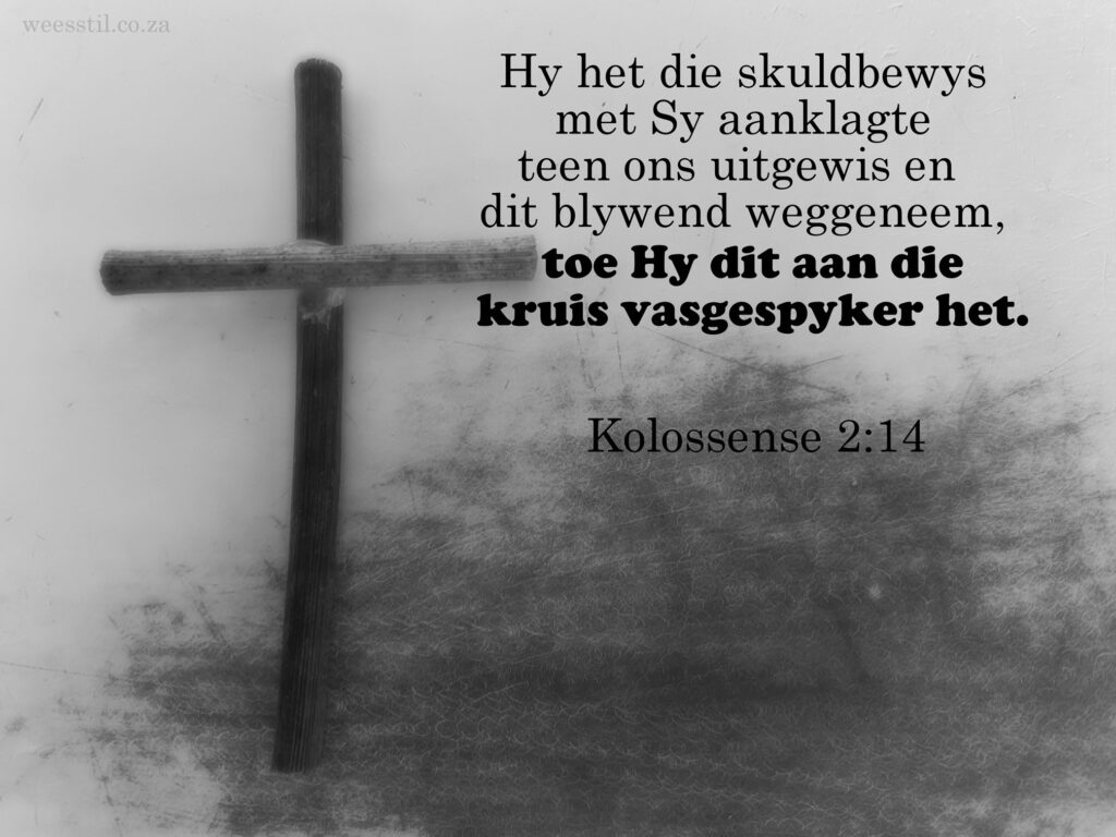 Ek het vir jou sondes gely, Ek die onskuldige in die plek van jou, die skuldige, sodat jy onbeskaamd voor Vader kan staan. Dit was My keuse, My geskenk aan jou. Ek is as mens gekruisig maar deur die Gees lewend gemaak. (1 Pet. 1:18) Verstaan jy steeds nie liewe kind na aan My hart? Ek het jou sondes aan die kruis vasgespyker en dit vir goed weggeneem. (Kol. 2:14)