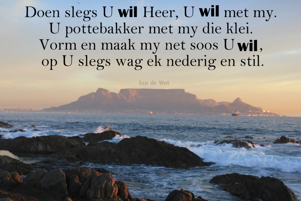 In die liedjie van Jan de Wet sing ons: Doen slegs U wil Heer, U wil met my. U pottebakker met my die klei. Vorm en maak my net soos U wil, op U slegs wag ek nederig en stil. Dan eindig die liedjie met hierdie kosbare woorde: Maak van my hart, Heiland U Troon, tot elk een Christus in my sien woon.